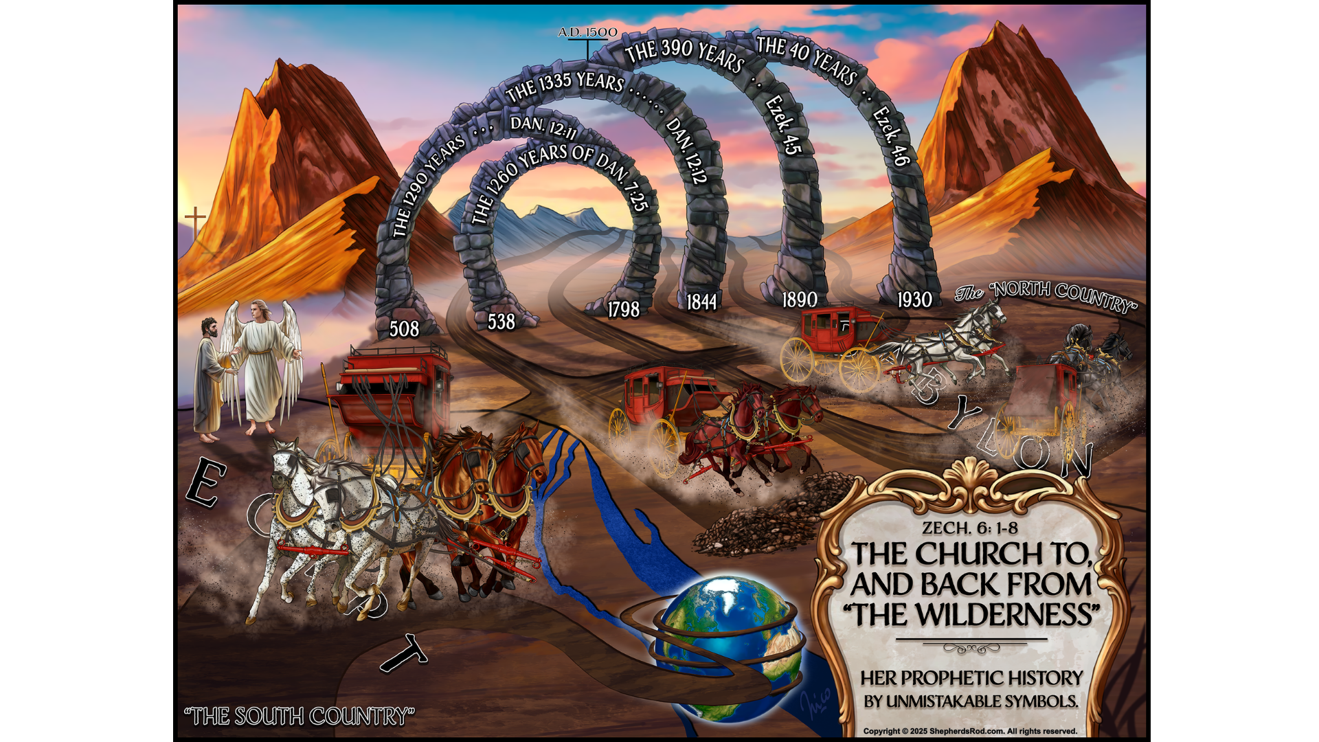 “. . . saith the Lord God; . . . I will bring . . . Nebuchadnezzar king of Babylon, . . . from the north.” Ezek. 26:7. Again: when the Jews were returning from Babylon to Jerusalem, God spoke through His prophet Zechariah, saying: “Ho, ho, come forth, and flee from the land of the north” (Zech. 2:6), thus identifying Babylon as “the north country.” But as we are dealing with the fulfillment of prophecy in the New Testament era, the north country in this connection must be antitypical Babylon—Christianized Rome—where God’s people during the New Testament period have gone. This clear-cut truth concerning the second chariot, leads us to the exposition of